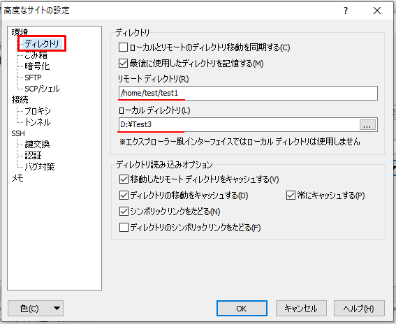 ダイアログ左の「ディレクトリ」をクリックし、「リモートディレクトリ」と「ローカルディレクトリ」に初期表示するディレクトリを指定します。完了後OKボタンを押します。