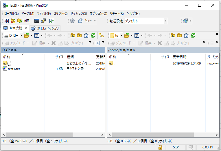 . 2019-09-29 16:53:46.929 Transfer done: 'D:\Test3\test3.txt' => '/home/test/test1/test3.txt' [22]