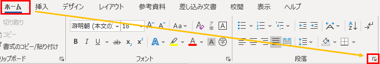 2.「ホーム」→「段落」の右下のアイコンをクリックします。