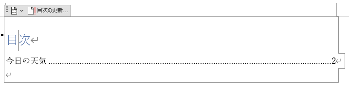 目次の場所に移動し「目次」と書かれた箇所をクリックし「目次の更新」をクリックします。