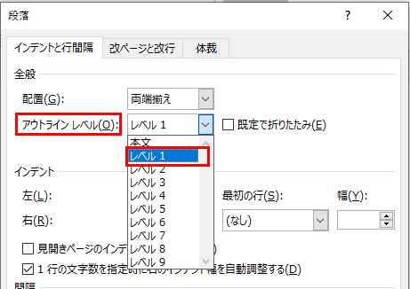 3.「アウトライン」→「レベル1」を選択します。
