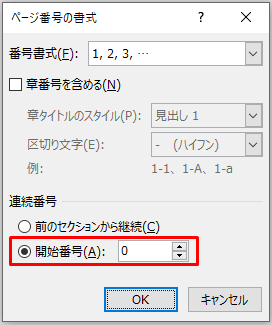 4.連続番号の開始番号に0をセットしてOKボタンを押すと1ページ目にページ番号は表示されず、2ページ目のページ番号が1になります。