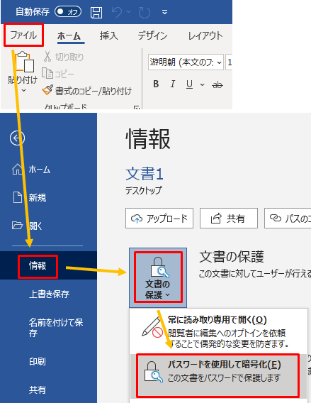 1.「ファイル」>「情報」>「文書の保護」>「パスワードを使用して暗号化」をクリックします。