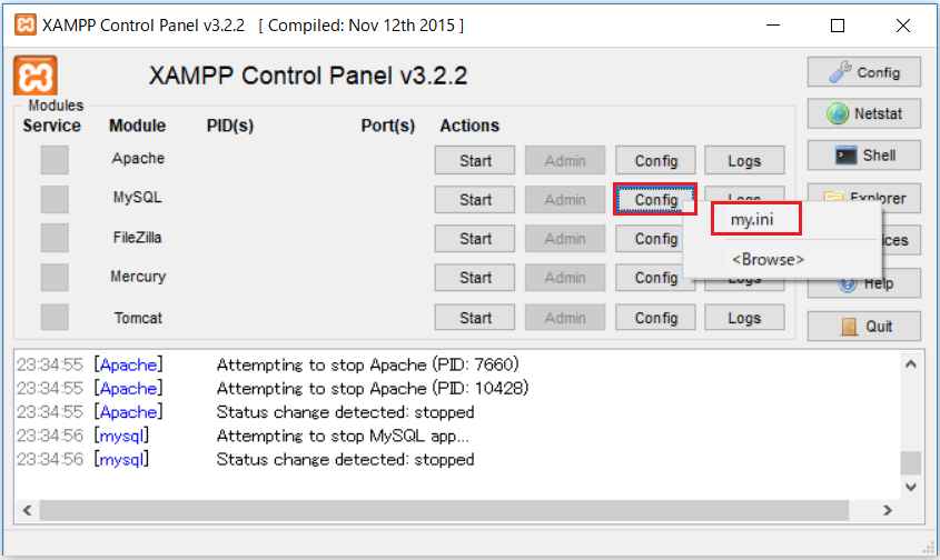 2.MySQLのConfigをクリックし、my.iniを選択してmy.iniを開きます。(図の赤枠の部分)