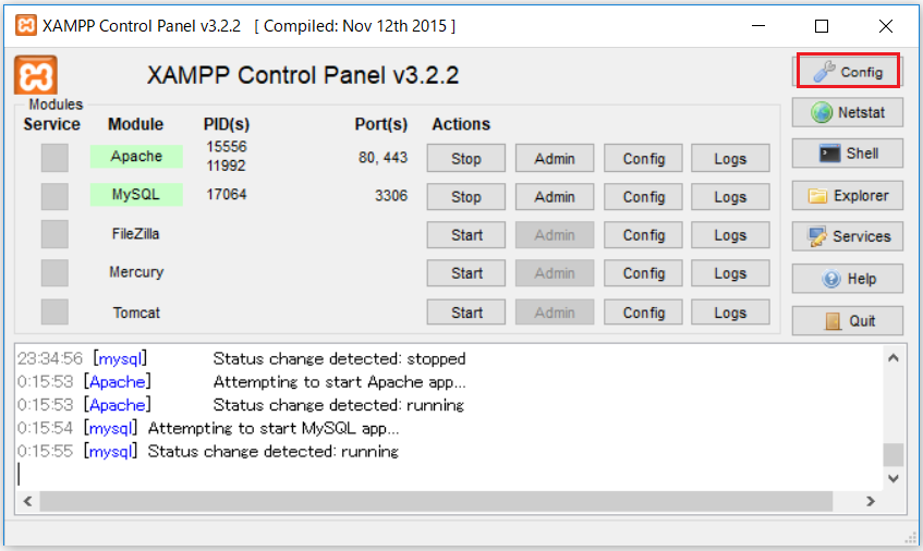 1.XAMPPコントロールパネルで「Config」をクリックします。
