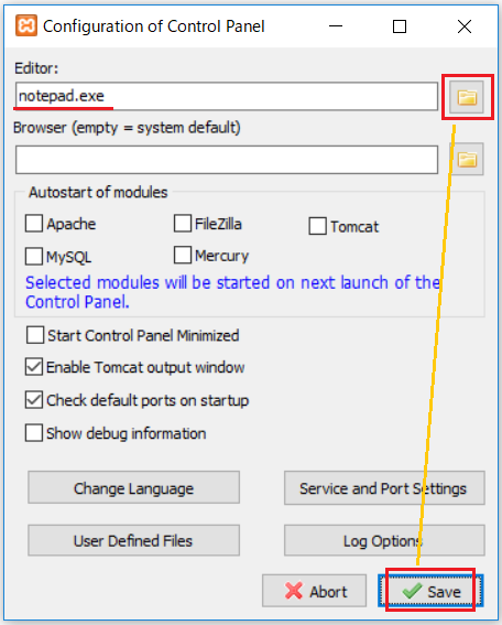 XAMPP Control Panelで開くテキストエディタを指定する方法です。