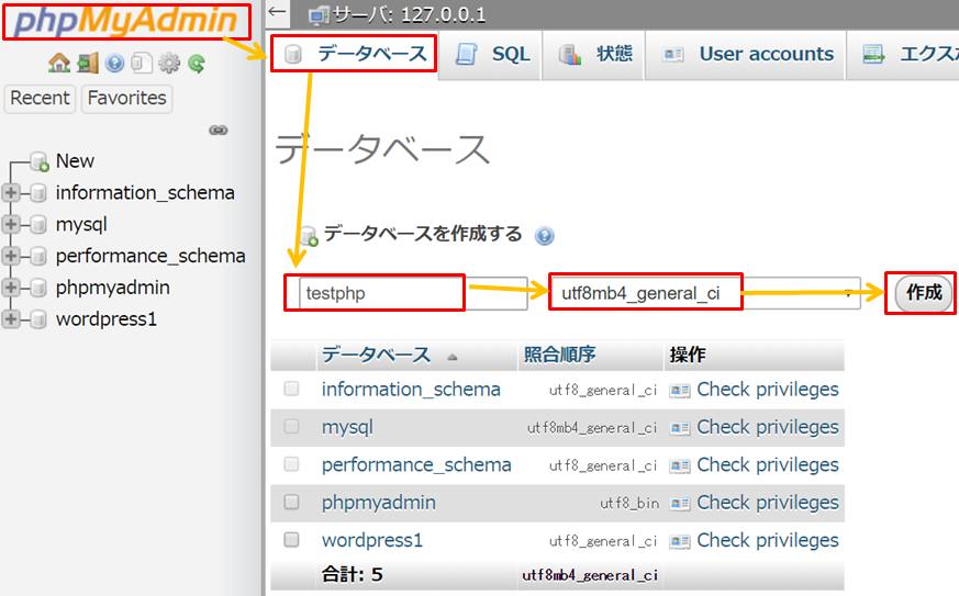2.「phpMyAdmin」をクリック→「データベース」タブをクリック→データベース名を入力→照合順序を選択して「作成」ボタンを押すとデータベースが作成されます。
