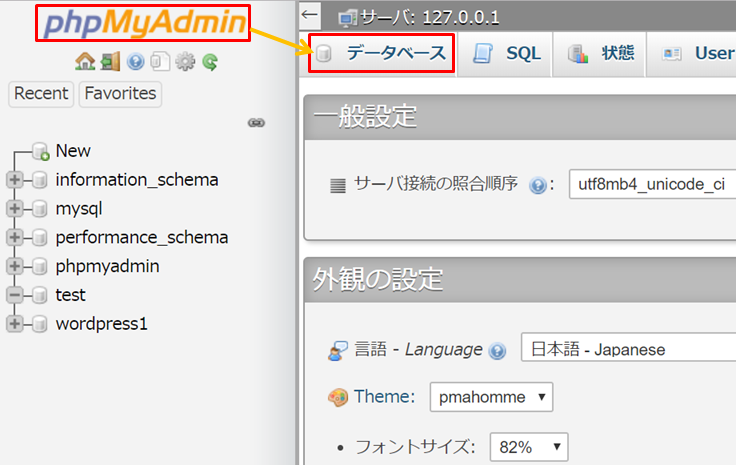 1.phpMyAdminの画面で、「phpMyAdmin」をクリックし、「データベース」をクリックします。