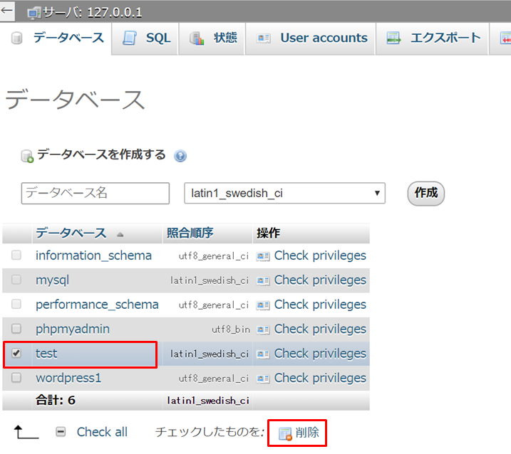 XAMPP phpMyAdminでデータベースを作成/削除する手順