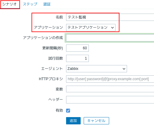 ZabbixのWebシナリオでURLを指定して監視するサンプルです。