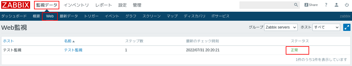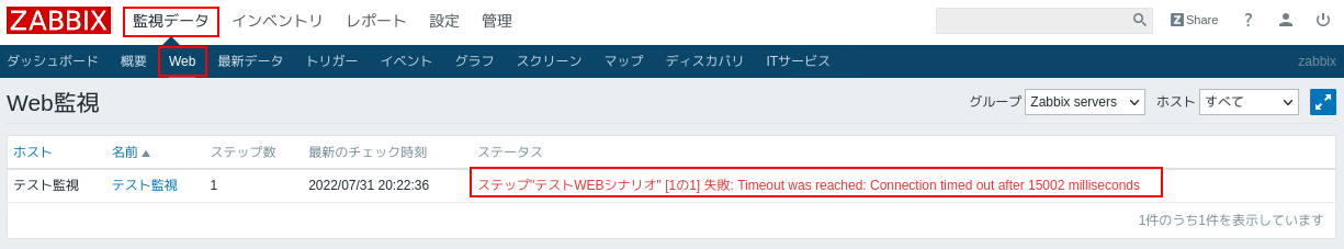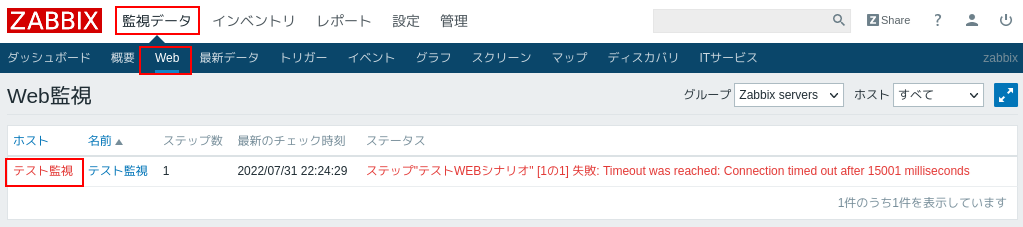 2.監視データ>Webをクリックするとホストの「テスト監視」が赤字になっています。