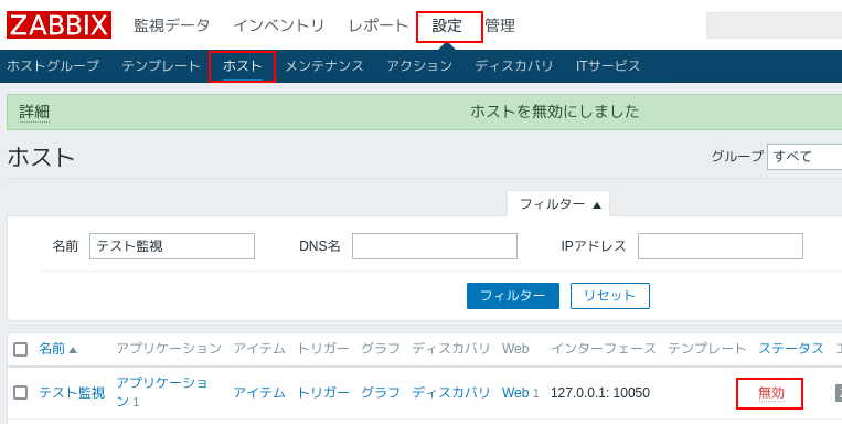 1.設定>ホストをクリックし、ステータスの「有効」をクリックするとホストを停止するか聞かれるのでOKをクリックするとステータスが「無効」になり確認処理が停止します。