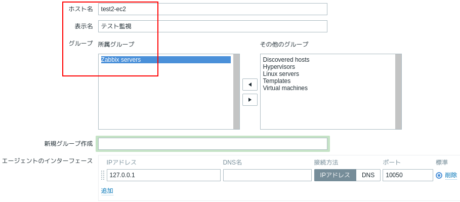 3.ホスト名と表示名を入力し、グループの所属グループを選択します。