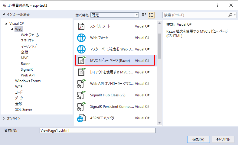 2.「MVC5 ビューページ(Razor)」を選択し「追加」ボタンを押します。
