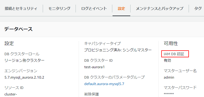 クラスターの設定でIAM DB認証の場合は、「有効」になります。そうでない場合は「無効」になります。