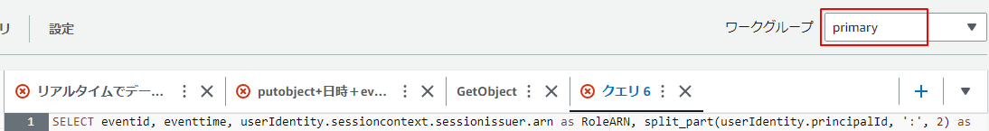 3.クエリエディタの画面を表示します。ワークグループの選択をprimaryにしています。