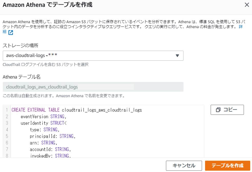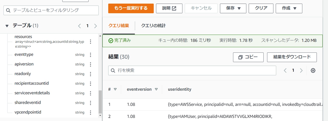 SQL文のfromの後のテーブル名は、画面左下のテーブルの下にあるcloudtrail_logs_aws_cloudtrail_logs_***をコピペして指定します。