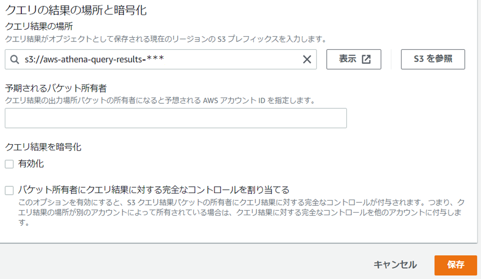 7.「S3を参照」をクリックしてクエリ結果の場所(aws-athena-query-resuts-***)を指定します。