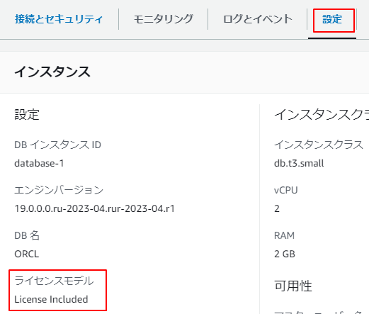 ライセンスタイプは、RDSのリンク>設定で確認できます。以下はlicense-included(li)です。