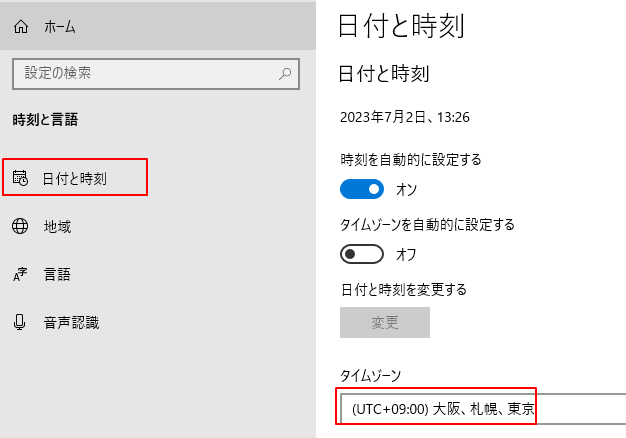 4.日付と時刻をクリックし、「タイムゾーン」で「UTC+9 大阪、札幌、東京」を選択します。