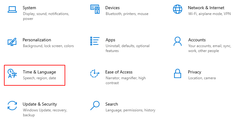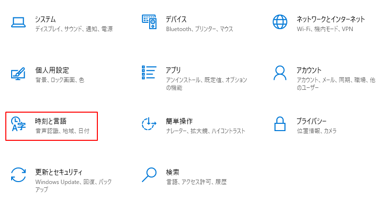 スタートボタンをクリックし設定のアイコンをクリックし「時刻と言語」から地域をクリックします。