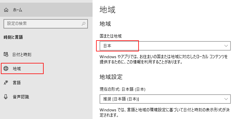 3.地域をクリックし、「国または地域」で日本を選択します。