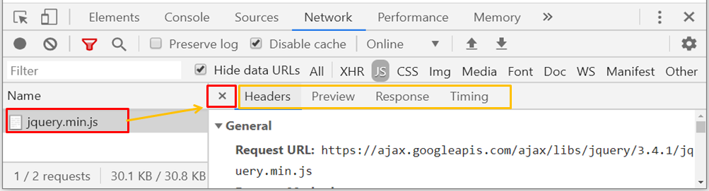 jsファイルをクリックすると、Headers,Preview,Response,Timingのタブが表示されそれぞれ確認できます。バツのアイコンを押すと閉じます。