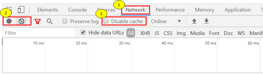 3の箇所の「Disable Cache(キャッシュを無効化)」は、チェックを入れるとキャッシュを無効にします。