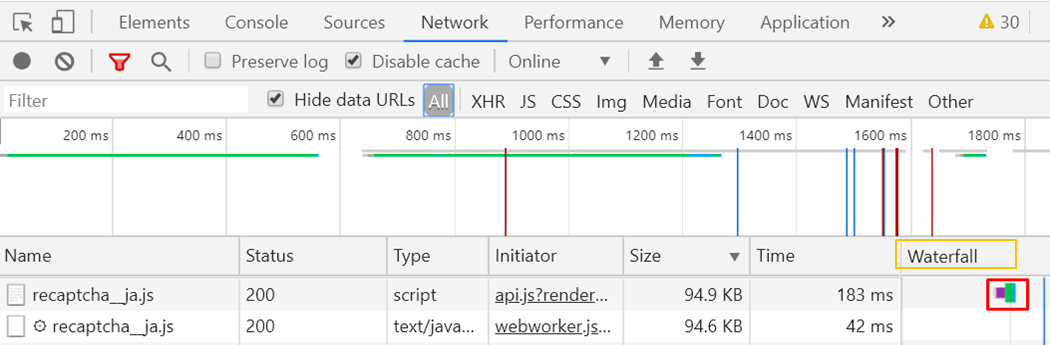 一番右の「Waterfall(ウォーターフォール)」は、それぞれのファイルがどれくらいの時間がかかったかがわかる項目です。