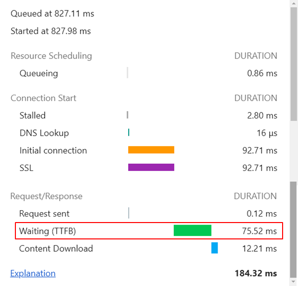 「Waiting(TTFB)(サーバーの応答を待機しています)」は、最初の1バイト(First Byte)が到着するまでの時間です。この時間は短いほうがよいです。上記図では、75ミリ秒となっています。