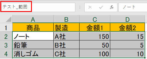 左上の入力欄で名前を選択するとシート上で対象の範囲が選択されます。