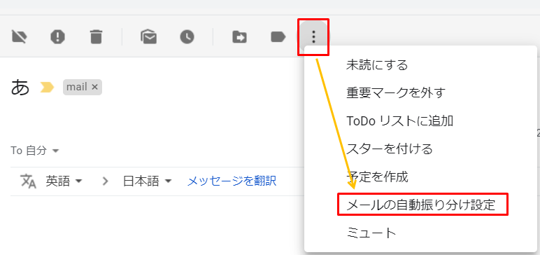 1.振り分けしたいメールを開き、縦の点がある箇所から「メールの自動振り分け設定」をクリックします。