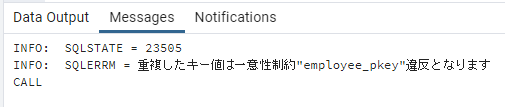例外発生時、14行目のSQLSTATEはエラーコードを、15行目のSQLERRMは、エラーメッセージを表示します。