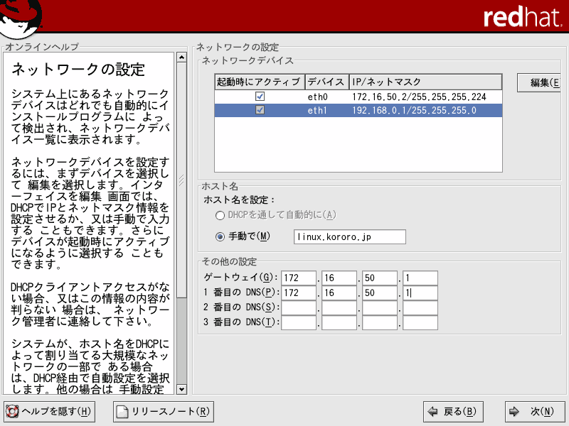 ここでは、Red Hat Linux9のインストールについて解説していきます。当ページでは、LINUX初心者を対象とした説明を行っていきます。はじめは何がなんだかわけがわからないかもしれませんが、それでも構わないと思います。特にディスクパーティションの設定は、初めての方にとっては非常にわかりづらいものです。各パーティションにどのくらいの容量をさけばいいのかは、用途や規模(企業用なのか、個人用なのか)、ディストリビューション、あるいはHDDの容量(デュアルブートをしたり等)によっても変わってくるため、頭を悩ますところです。Linux