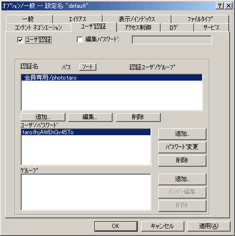 以下の画面のようになったら設定は完了です。指定したディレクトリ「/photo」はユーザ名とパスワードなくしてログインすることはできないようになりました。尚、ユーザ認証画面を他人に編集されないようにするためには、「編集パスワード」にチェックを入れて、出てきたダイアログにパスワードを入力して「OK」ボタンをクリックしてください。この設定をするとパスワードを入力しない限り、ユーザ認証画面を第3者に勝手に編集されることがなくなるので、よりセキュアな状態になります。