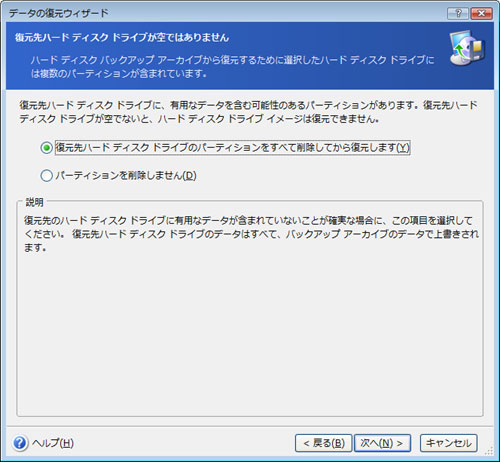 データを完全に消去しても問題ない場合に、「復元先ハードディスクドライブのパーティションをすべて削除してから復元します」にチェックをいれて「次へ」をクリックします。