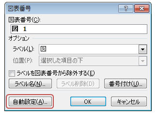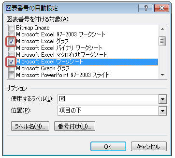自動的に図表番号を付けるオブジェクトの種類にチェックを入れ「OK」をクリック