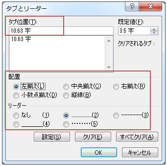★タブ位置や配置(○揃え)も変更できます。全てのタブを削除したい場合は「すべてクリア」をクリックします。