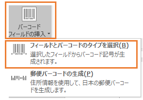 「バーコードフィールドの挿入▼」−「フィールドとバーコードのタイプを選択」をクリック