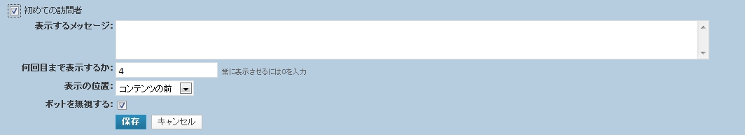 初めての訪問者にメッセージを表示。メッセージ、表示回数などを設定。