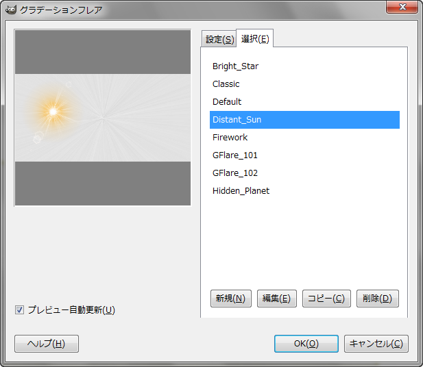 GIMP > フィルタ > 照明と投影 > グラデーションフレア