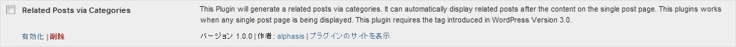 管理パネルで、「プラグイン」をクリックし、プラグイン設定画面を開く。「 Related Posts via Categories 」を探し有効化。