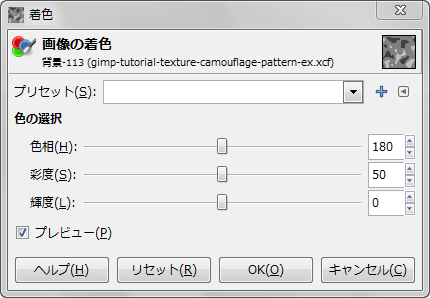 「ツール⇒色ツール⇒着色」もしくは「色⇒着色」で、「着色」ダイアログを呼び出す。