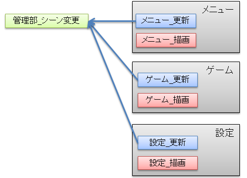 「メニュー、ゲーム、設定」という3種類のシーンがあり、そのシーンを管理部が管理している仕組みです。