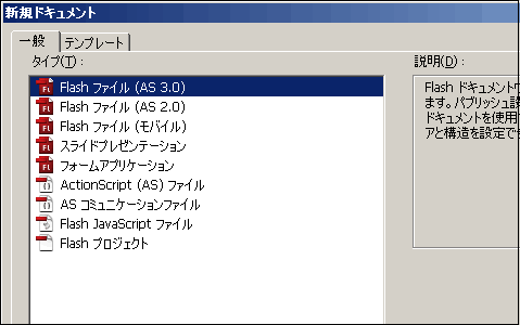 ファイルの新規作成を行い「Flashファイル (AS 3.0)」を選択します。
