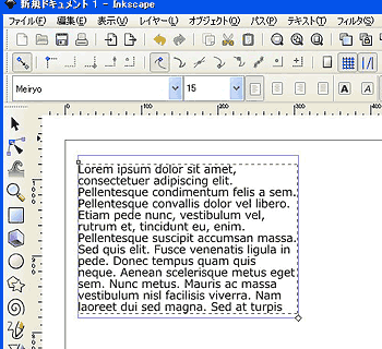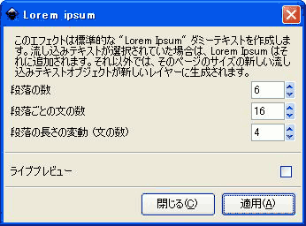 メニューバーの[エクステンション]メニューより、[テキスト]-[Lorem Ipsum]を選択して[Lorem Ipsum]ダイアログを開き、段落数などを設定後、