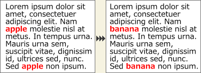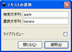 使い方は、メニューバーの[エクステンション]メニューより、[テキスト]-[テキストの置換]を選択して[テキストの置換]ダイアログを開き、検索文字列、置換文字列をそれぞれ入力後、