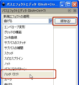描いたパスを選択後、[パスエフェクトエディタ]より[ハッチ(ラフ)]を選択し、[追加]します。