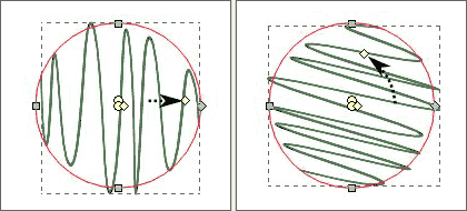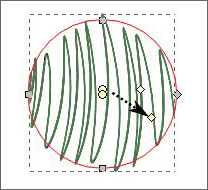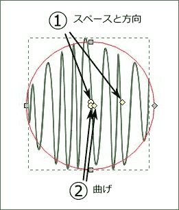 (ノードツール)でハッチをクリックすると、小さな円とひし形が2つずつ表示されます。これらを使って、ハッチのスペースや方向、曲げの量などを調整できます。