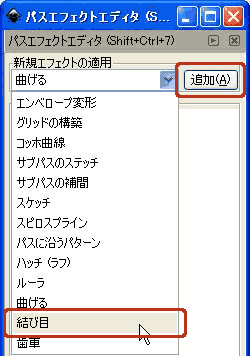 パスにストロークを設定し、選択後、[パスエフェクトエディタ]より[結び目]を選択し、[追加]します。